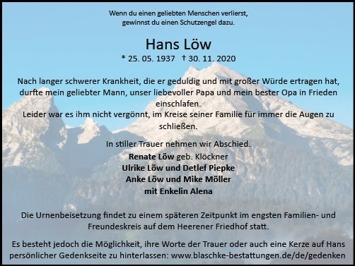 Wir behalten Hans in guter Erinnerung und wünschen Euch viel Kraft und Zuversicht.